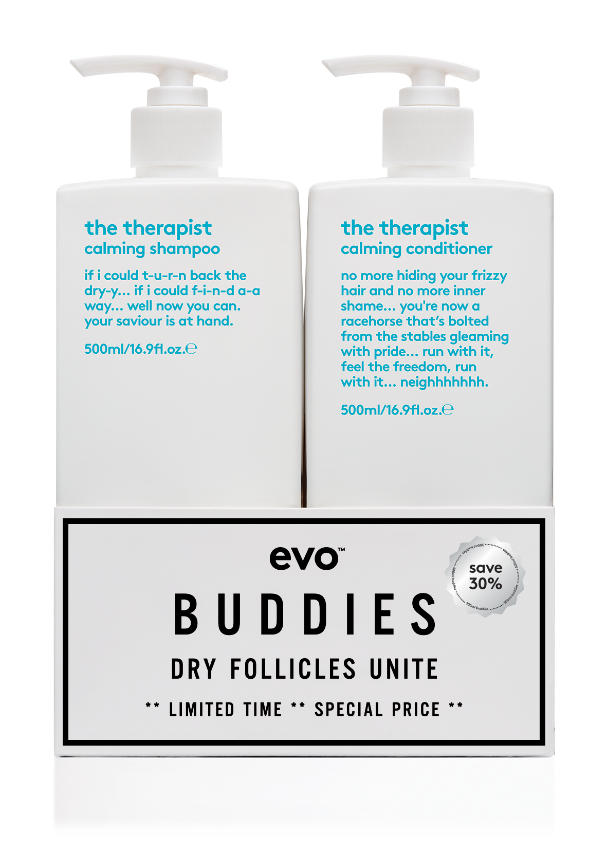 Vi har fundet Evo The Therapist Buddies Shampoo Conditioner X – Ml – Hos Frisøren Baronen fra Evo hos Frisøren og Baronen i kategorien Sæt Tilbud. The therapist hydrating shampoo koncepten fugtighedsgivende shampoo, der renser, plejer og styrker håret.anbefalet tiltørt og farvebehandlet hår.fordelehjælper med at styrke håret, modvirker at hårfaven falmer og reducerer krus. sulfat-frie rense aktiver,