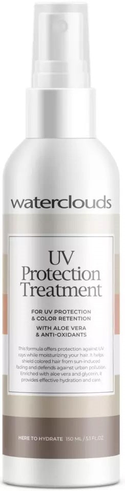 . Waterclouds UV Protection Treatment 150ml Beskyt og plej dit hår med Waterclouds UV Protection Treatment en nærende leave-in behandling, der skaber en usynlig barriere mod solens skadelige stråler. Den er udviklet til at modvirke udtørring, falmet hårfa